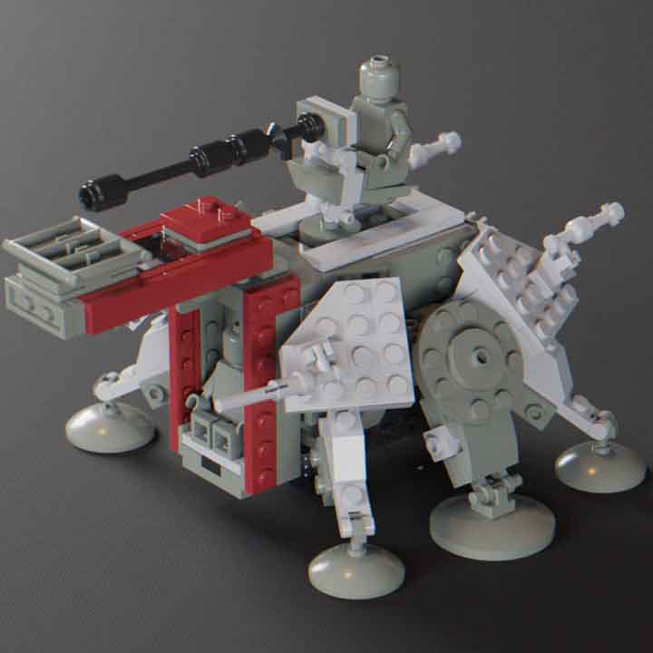 The AT-TE is one of the most iconic designs from the Star Wars Prequel Trilogy. With its unique looks and great functionality, the it is one of the most beloved Star Wars vehicles. Our model captures all of the essential details of the AT-TE: the cock-pit’s front opens up to reveal the driver’s seat, the top gun can fit a minifigure, the back opens up and the roof of the model comes off to reveal space for two minifigures and a gun rack. The color scheme of the model matches the original source material, featuring the dark red cab and a mix of dark and light blueish grey for the rest of the body. The legs are also accurate, featuring six total legs with the middle two being slightly larger than the front and the back.